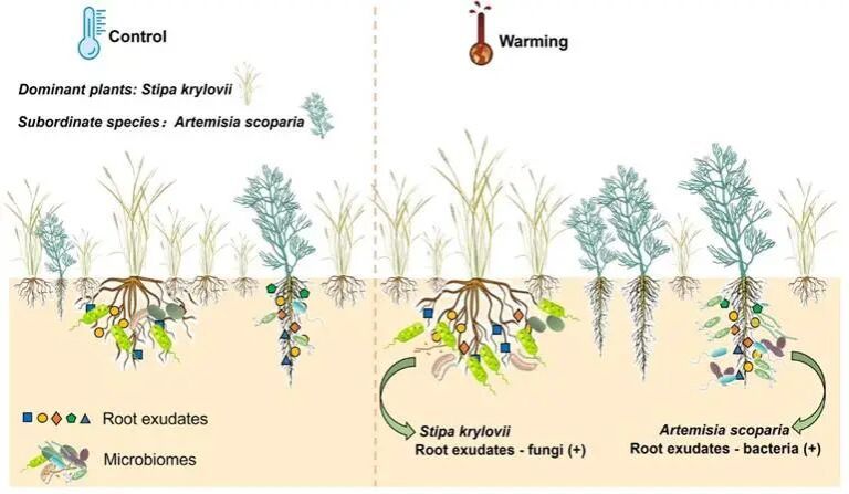 Figure 1 Warming favors fungal partnerships in dominant plants (Stipa krylovii) but bacterial alliances in subordinate species (Artemisia scoparia).